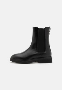 Bottes Chelsea en cuir noir avec panneaux élastiques latéraux, bout pointu et semelle en caoutchouc plate. Texture lisse et design minimaliste.