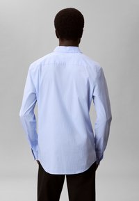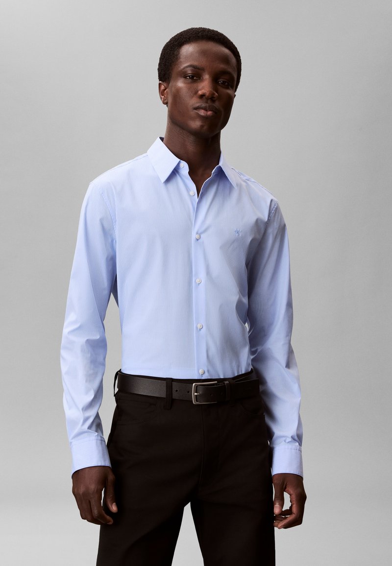 Homme portant une chemise habillée bleu clair à fines rayures, un pantalon noir et une ceinture noire, debout devant un fond gris uni.