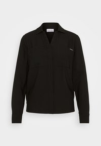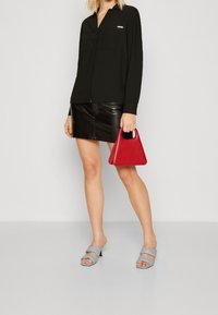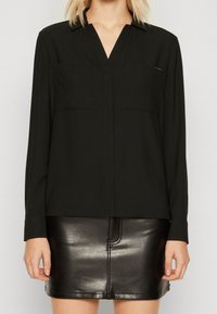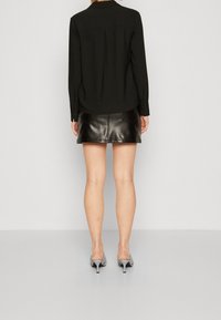 Femme portant une chemise noire à manches longues avec col et poches poitrine, ainsi qu'une mini-jupe en cuir noir, sur un fond uni.
