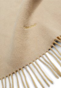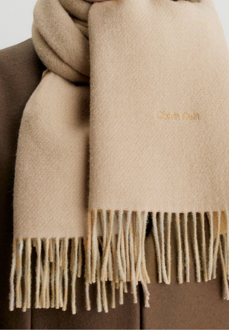 Écharpe en laine beige aux extrémités effilochées, enroulée autour d'une personne portant un manteau marron, avec une broderie discrète du logo Calvin Klein.