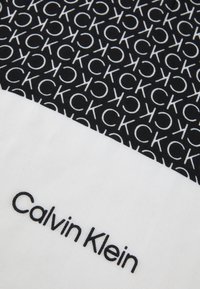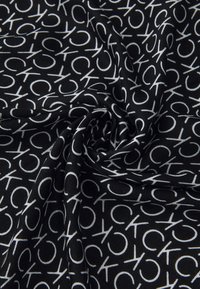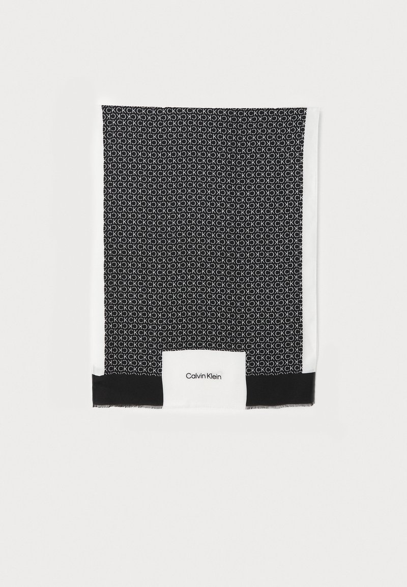 Écharpe rectangulaire en noir et blanc avec motif répétitif "CK" et logo Calvin Klein à une extrémité.