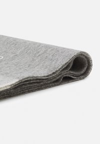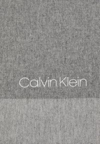 Écharpe grise en tissu doux, avec une bordure gris clair et des franges à une extrémité. Logo "Calvin Klein" brodé en blanc.