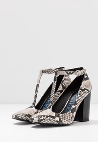 Escarpins en imprimé serpent noir et blanc avec un design à bande T, talon épais, bout pointu et matériau texturé.