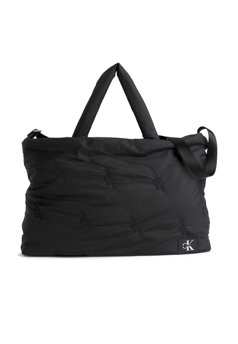 Sac polochon noir matelassé avec poignées supérieures, bandoulière réglable et petit patch logo Calvin Klein dans le coin inférieur.