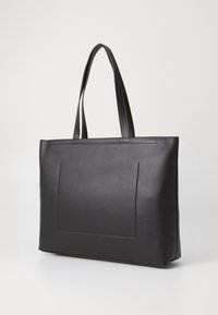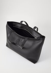Sac cabas en cuir noir avec longues anses et logo "cK" embossé centré sur le devant, sur un fond clair uni.