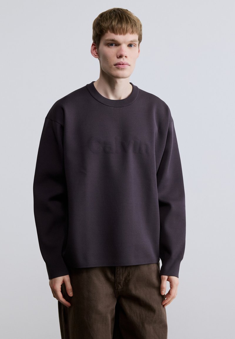 Sweatshirt gris foncé à col rond avec un logo Calvin texturé. Il présente des épaules larges et tombantes ainsi qu'une coupe décontractée, fabriqué dans un tissu doux.