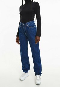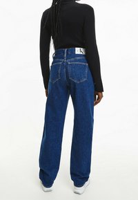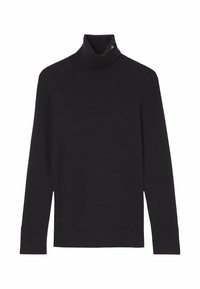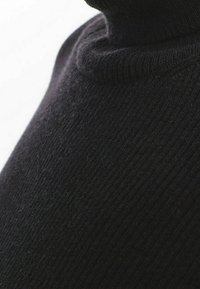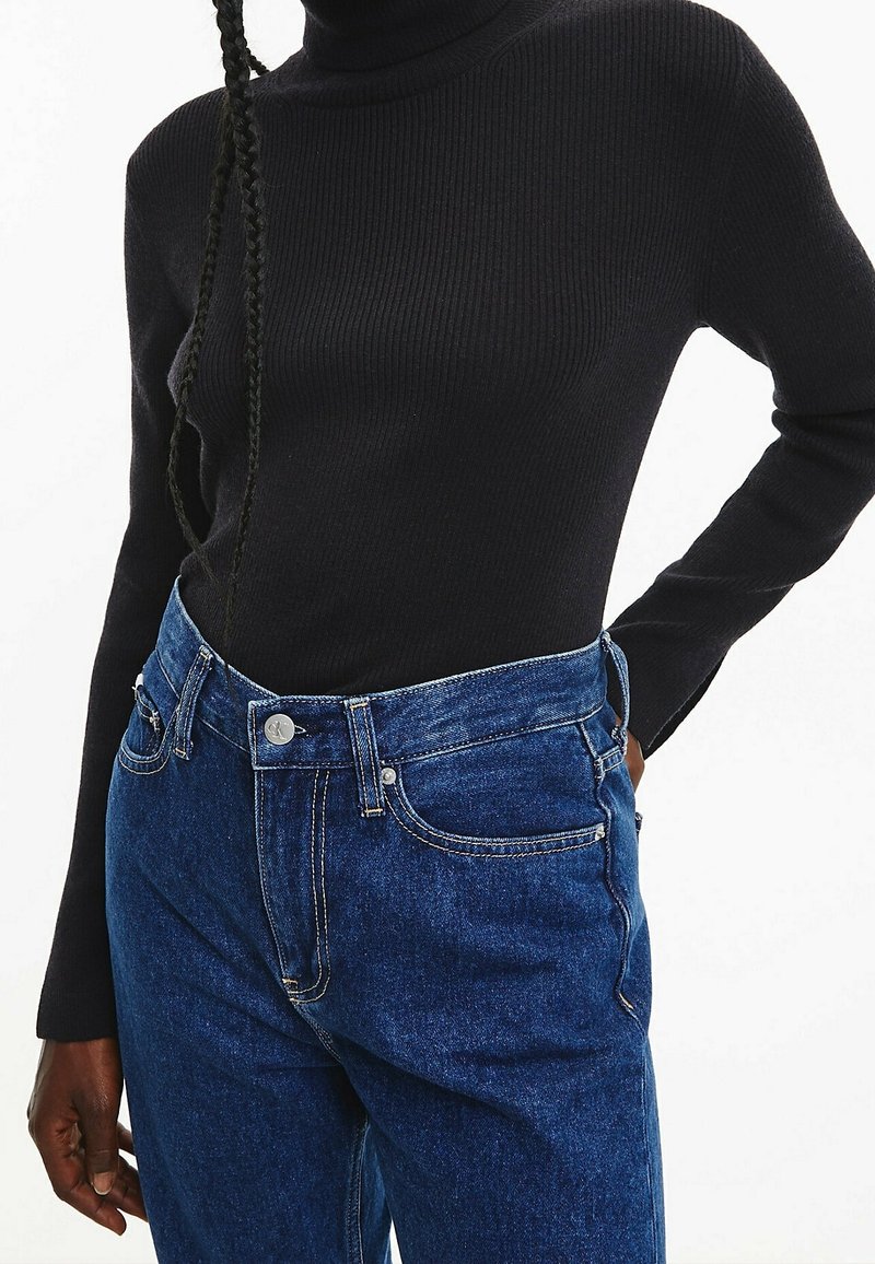Pull noir côtelé à col roulé associé à un jean bleu taille haute, avec une fermeture à boutons et un design à cinq poches.
