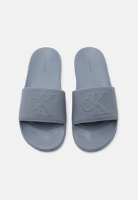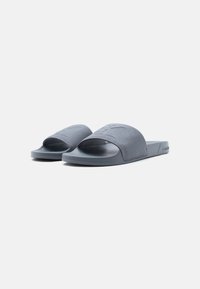 Sandale slide grise unique avec large bande en tissu et semelle profilée, vue de profil sur fond blanc uni.