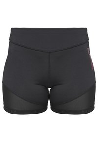 Shorts de sport noirs avec panneaux en mesh, taille haute et détail de logo rose. Associés à des chaussures de sport blanches.