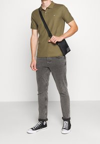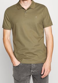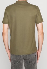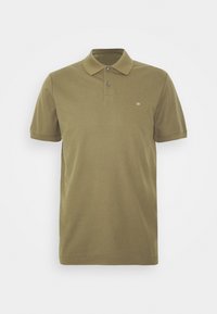 Polo vert olive en mélange de coton, manches courtes, patte à trois boutons, et petit logo brodé sur la poitrine.