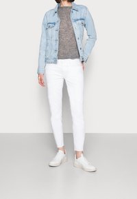 Femme portant un pull gris à manches longues semi-transparent avec ourlet côtelé et pantalon blanc, visible du cou aux hanches sur un fond neutre.