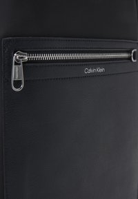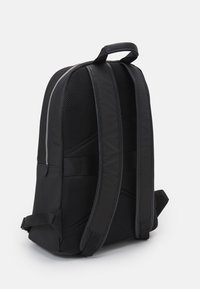 Sac à dos noir en nylon, doté d'une grande poche zippée à l'avant, d'un logo, d'un dessus arrondi et de bretelles doubles. Texture lisse.