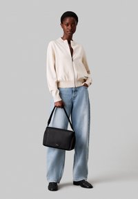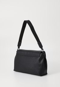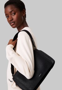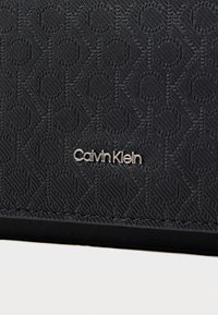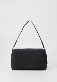 Sac à bandoulière noir Calvin Klein avec fermeture à rabat, motif de logo subtil et bandoulière réglable sur un fond uni.