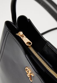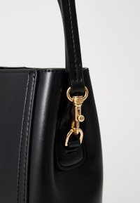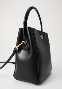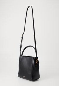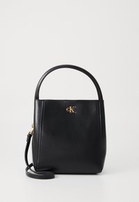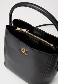 Sac à main en cuir noir avec poignée courte, bandoulière réglable, et petit logo doré "cK" au centre avant.