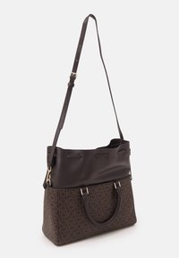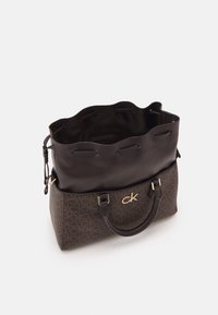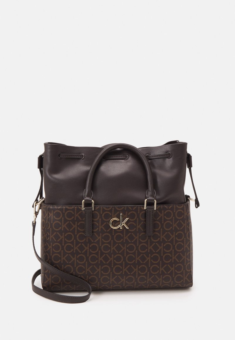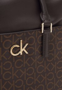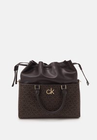 Sac à main brun foncé avec motif monogramme CK, logo CK doré, poignées courtes, et bandoulière ajustable sur un fond uni.