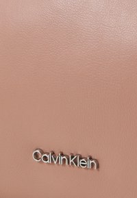 Sac à main en cuir rectangulaire beige avec une bandoulière réglable et une fermeture à glissière, doté d'un petit logo argenté Calvin Klein à l'avant.
