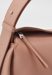 Sac à main en cuir rose blush avec bandoulière chaîne argentée et logo "CK" argenté sur le rabat avant, sur fond blanc uni.