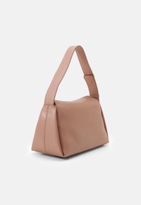 Sac à main en cuir rose avec une seule bandoulière réglable, fermeture éclair, texture lisse, et un petit logo gravé à l'avant.