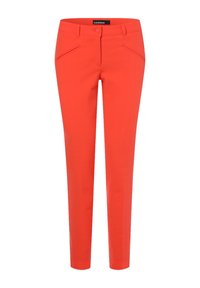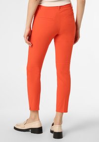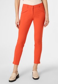 Femme portant un pantalon slim orange vif et des mocassins beiges, se tenant devant un fond clair.