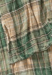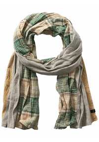 Écharpe douce aux textures mixtes présentant un motif à carreaux verts et beiges, accompagné de panneaux tricotés unis gris et marron clair, portée en boucle lâche.