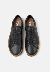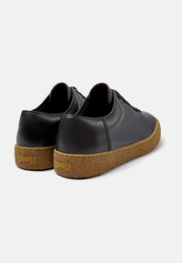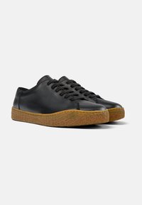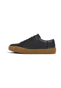 Baskets basses en cuir noir avec lacets noirs et semelle en caoutchouc gomme, vues de profil sur fond blanc.