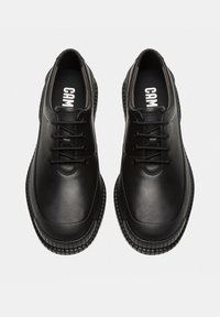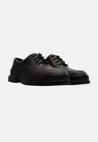 Chaussures noires à lacets avec une semelle en caoutchouc texturée et un bout arrondi. Portées avec des chaussettes grises montant jusqu'à la cheville. Les chaussures ont une finition lisse et mate.