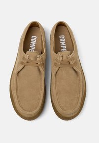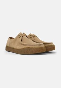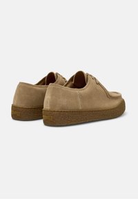 Chaussures en daim beige avec un bout rond, un design minimaliste à lacets, et une semelle en caoutchouc marron texturée. La tige a une finition lisse.