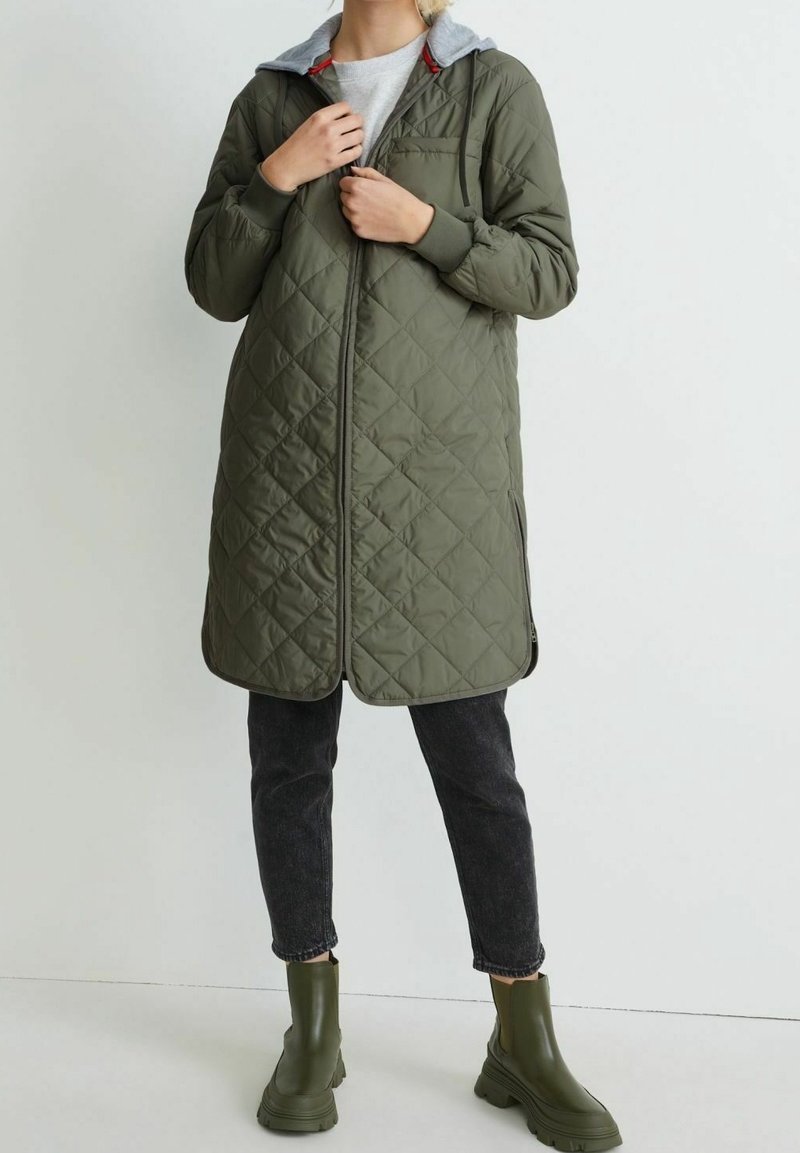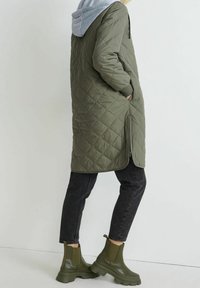 Personne portant une longue veste matelassée vert olive avec une capuche grise, un jean noir court et des bottes vertes assorties.
