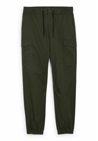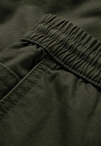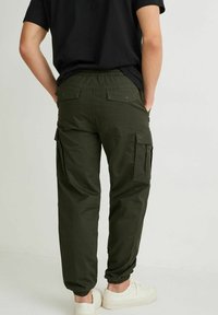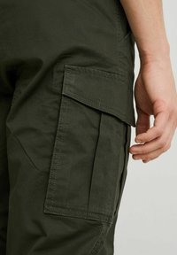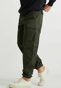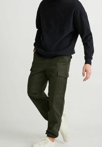 Pantalon cargo en coton vert olive avec plusieurs poches, associé à un sweat-shirt noir avec un logo embossé, porté avec des baskets blanches.