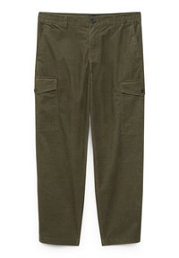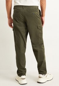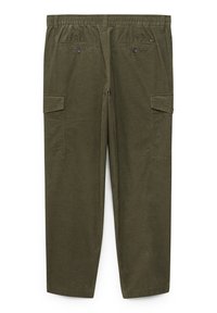 Homme portant un pantalon cargo vert olive avec des poches à rabat, associé à des baskets blanches, debout devant un fond uni.