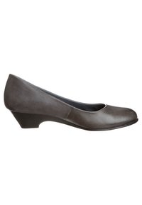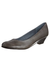Escarpin de ville pour femme en cuir gris, à talon bas, bout arrondi et doublure intérieure rembourrée.