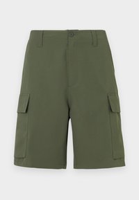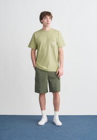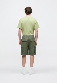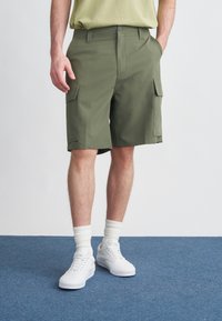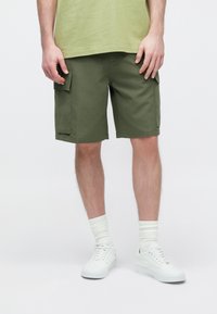 Shorts cargo vert olive avec poches avant et latérales, fermeture par boutons et plis, associés à des baskets blanches et des chaussettes côtelées.