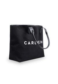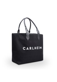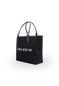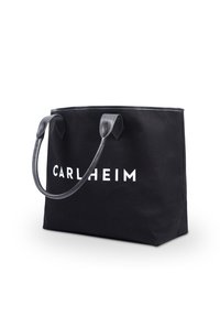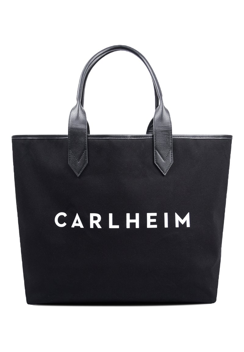 Sac fourre-tout noir avec poignées en cuir et "CARLHEIM" imprimé en lettres capitales blanches sur le devant.