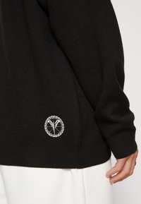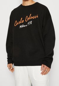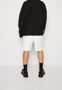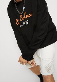 Sweat-shirt noir avec texte orange et blanc ; shorts blancs avec deux poches et logo brodé ; chaussettes noires et chaussures noires épaisses.