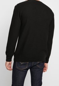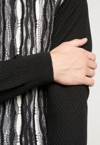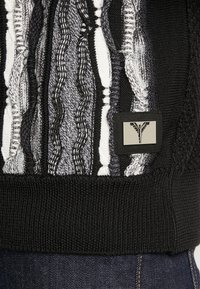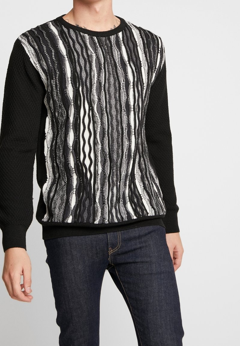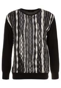 Pull noir avec un motif rayé texturé en blanc et gris à l'avant. Présente un col rond, des poignets et un ourlet côtelés.