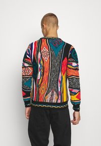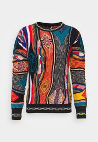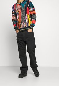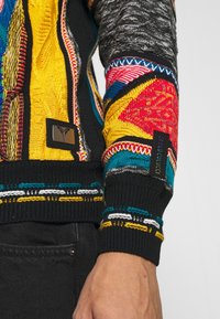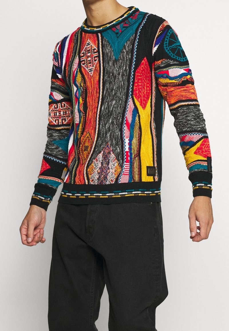 Pull multicolore avec motifs complexes ; présente des fils texturés, un col rond, ainsi que des poignets et un ourlet côtelés ; principalement noir, rouge, jaune et bleu.
