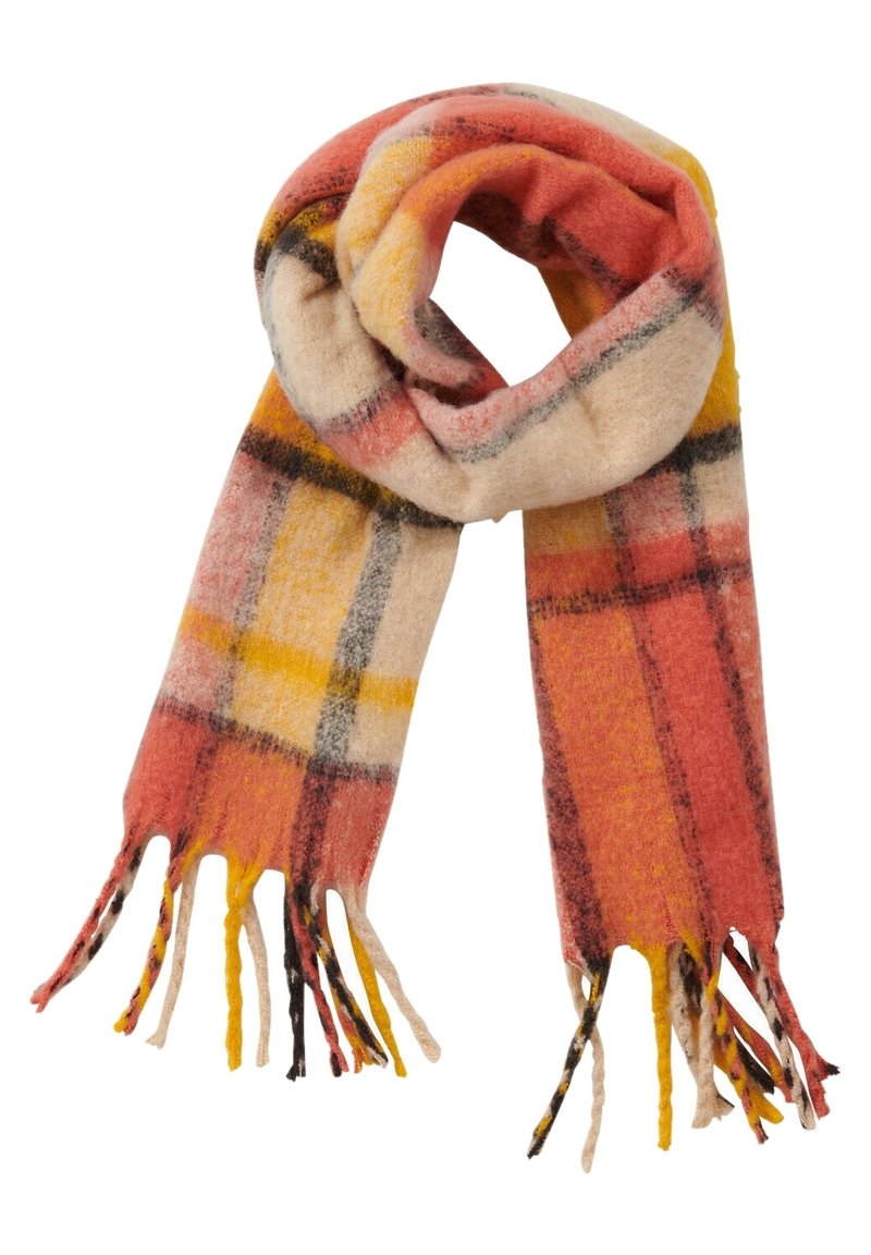 Écharpe en laine douce à motif à carreaux orange, jaune, beige et noir, avec des extrémités à franges, pliée en boucle.