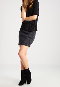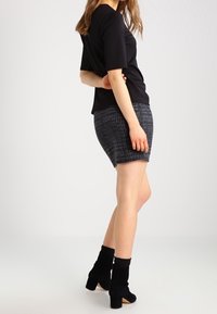 Mini-jupe noire à motifs avec un tissu texturé, coupe ajustée, associée à des bottines noires. Mise en avant du design et des matériaux de la jupe.