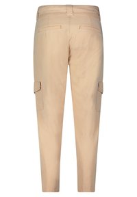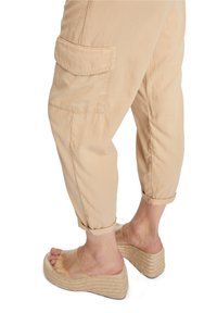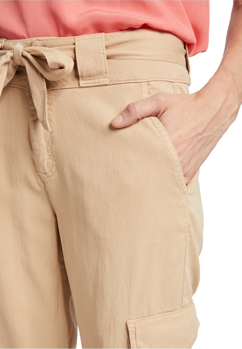 Pantalons cargo beiges avec une taille à nouer, dotés de poches latérales et d'une texture subtile. Le tissu semble léger et décontracté.