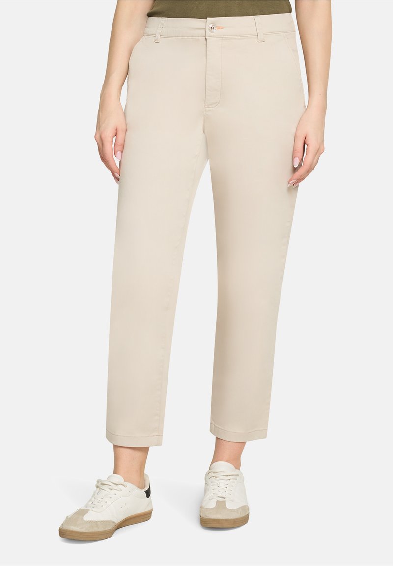 Chinos beige avec une coupe droite, dotés d'une fermeture boutonnée et de poches avant, associés à des baskets blanches et beiges.