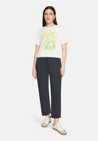 Pantalon bleu marine à coupe ajustée, en coton, taille mi-haute, fermeture avant par bouton, ourlets à revers, associé à des baskets blanches.