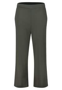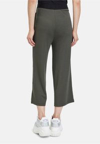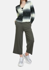 Personne portant un pantalon large court olive, un haut noir et des baskets blanches épaisses, debout avec une main dans la poche.