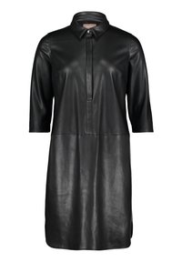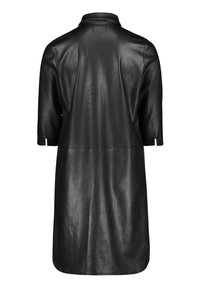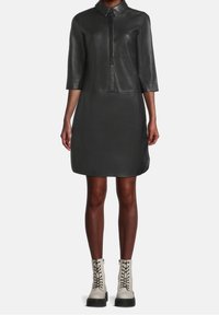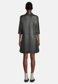 Robe en cuir noir avec un col et des manches trois-quarts, présentant une silhouette élégante et une coupe droite se terminant au-dessus du genou.