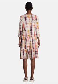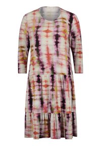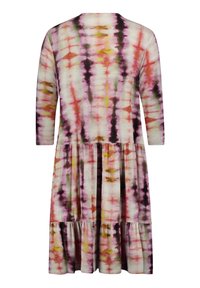 Robe tie-dye à manches trois quarts, présentant des motifs roses, jaunes et noirs. Bas à volants, fabriquée en tissu doux et léger.