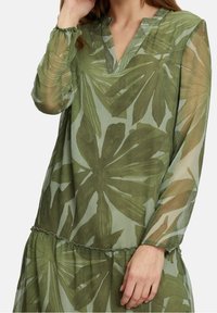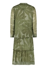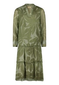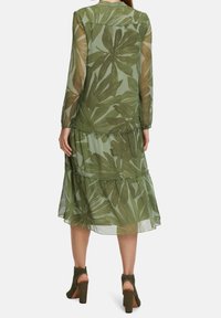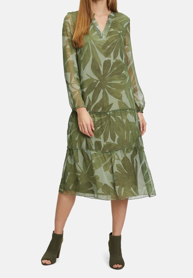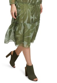Femme portant une robe midi transparente verte avec de grands motifs de feuilles et des manches longues, associée à des bottines à talons ouvertes vert olive.