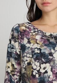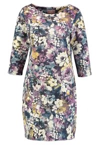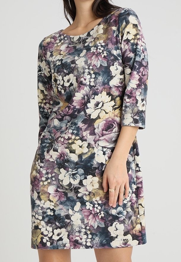 Robe fleurie avec un col rond et des manches trois-quarts. Présente une variété de couleurs comprenant du violet, crème et bleu sarcelle dans un tissu texturé.
