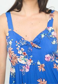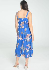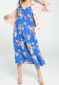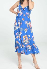Maxi robe bleue à fleurs avec un corsage ajusté, des bretelles réglables et un ourlet évasé à volants. Motifs de fleurs roses et orange. Talons transparents.