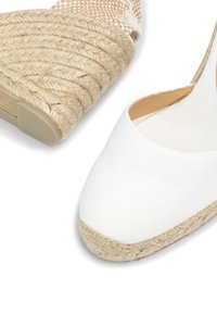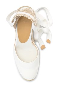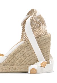 Sandale compensée blanche en espadrille avec semelle en jute tressée, bout fermé, talon tissé et liens à nouer autour de la cheville.