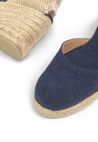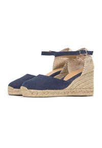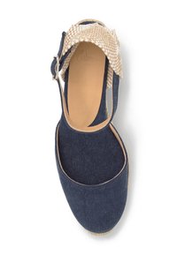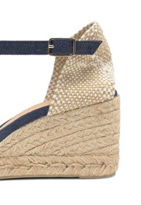 Chaussure espadrille compensée avec tige en tissu bleu marine, bride à la cheville avec boucle, talon beige tressé et semelle plateau en jute tressé.