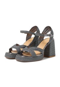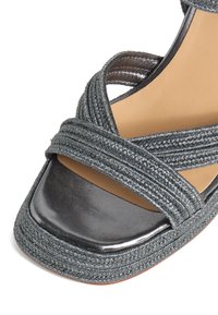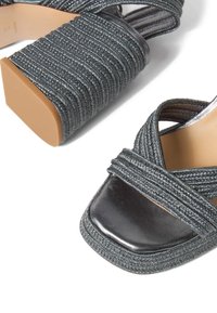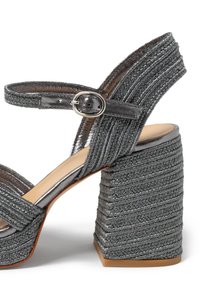 Sandale à talon haut et épais avec des brides grises tissées, boucle à la cheville et talon bloc épais, présentant un design texturé en couches.